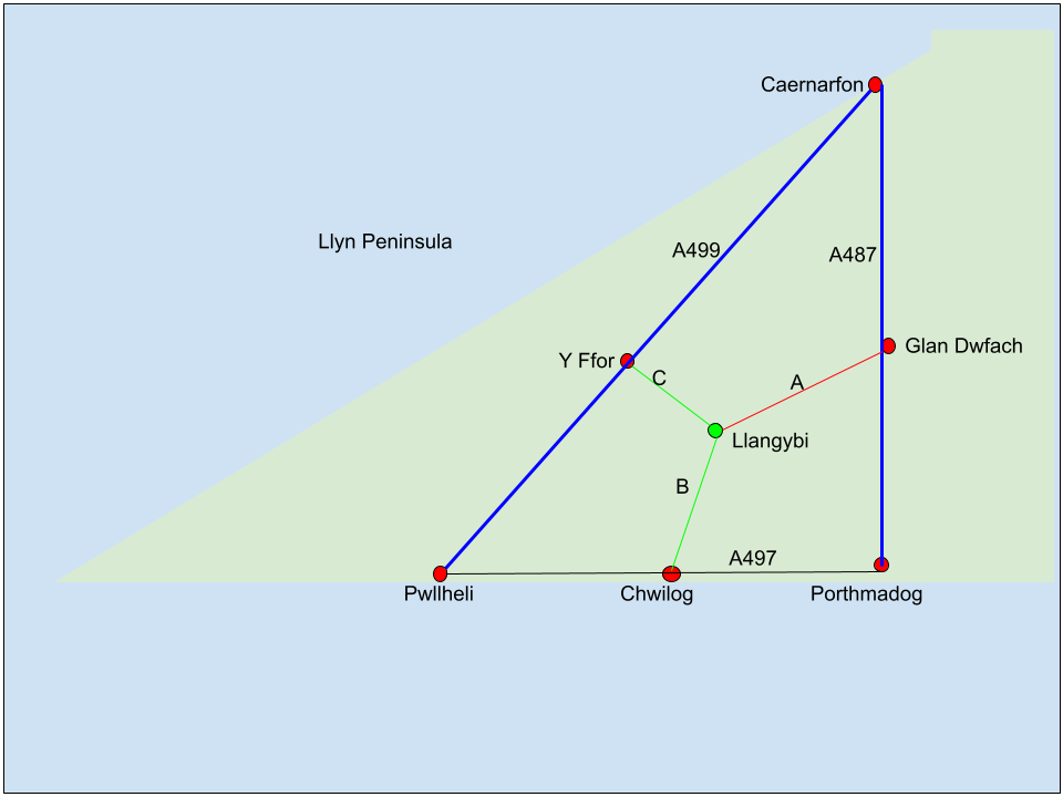 So if coming from the north it might be better to turn onto the A499 south of Caernarfon and then turn east at the village of Y Ffor, via route C, which is about half the distance. Many of the lanes on this route are wide enough to pass oncoming vehicles with ease.