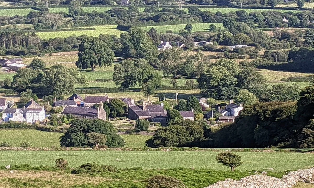 A scenic view of a countryside with green fields, trees, and scattered houses under a clear sky.